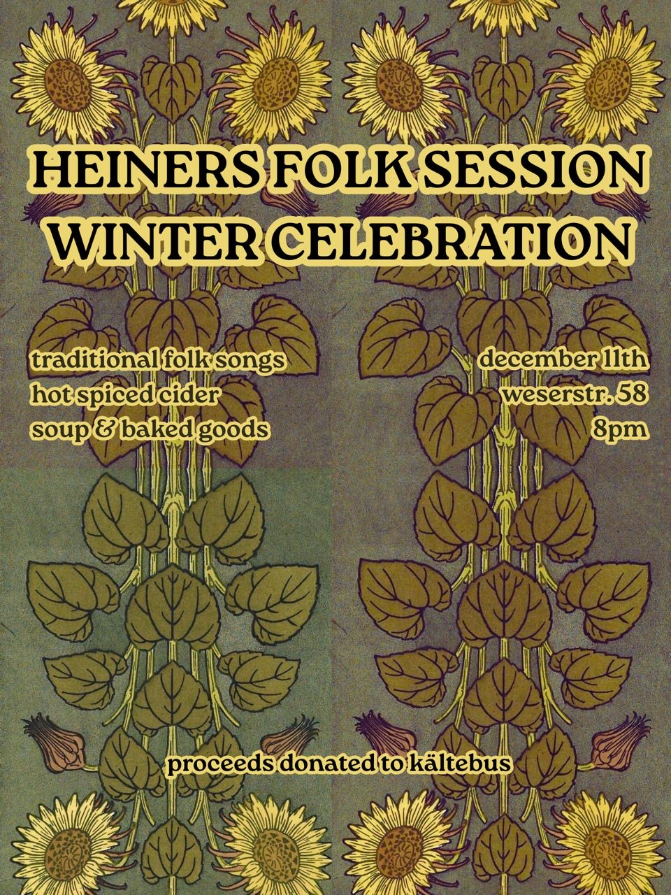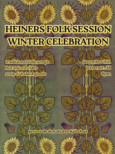 Concert. Traditional Folk Songs, Hot spiced cider, soup & baked goods.   Proceeds donated to kältebus    Weserstr 58    #heiners