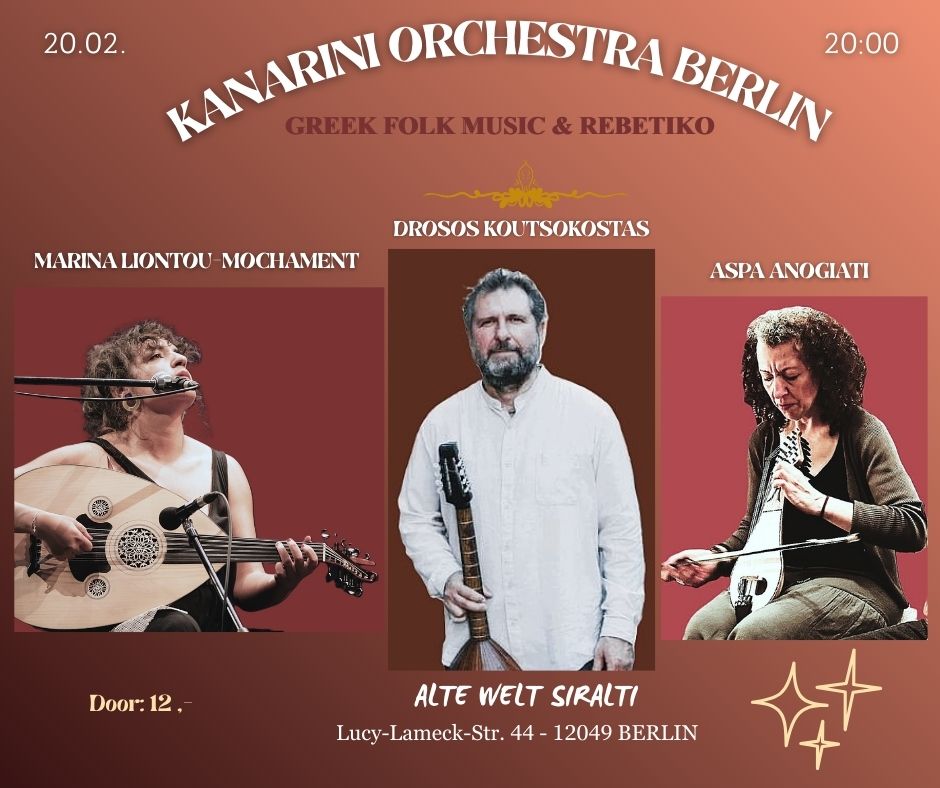 Greek music & Rebetiko.  Marinaliontou Mochament, Drosos Koutsorostas, Aspa Anogiati @ Alte Welt Siralti. kanarini.de #greek #concert