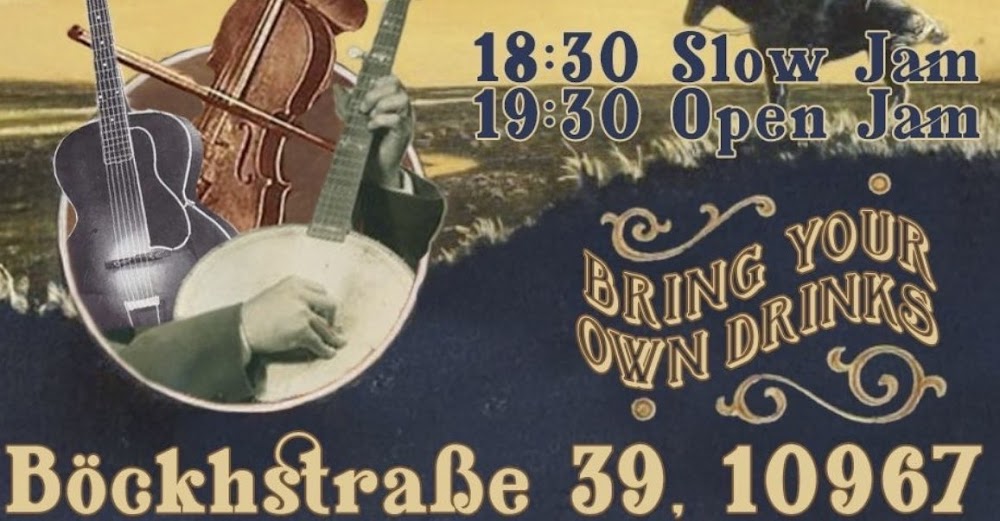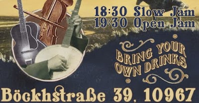 Every third Tuesday.  All skill levels of fiddle, banjo, guitar, and bass. This time at two fellas in Pankow!
