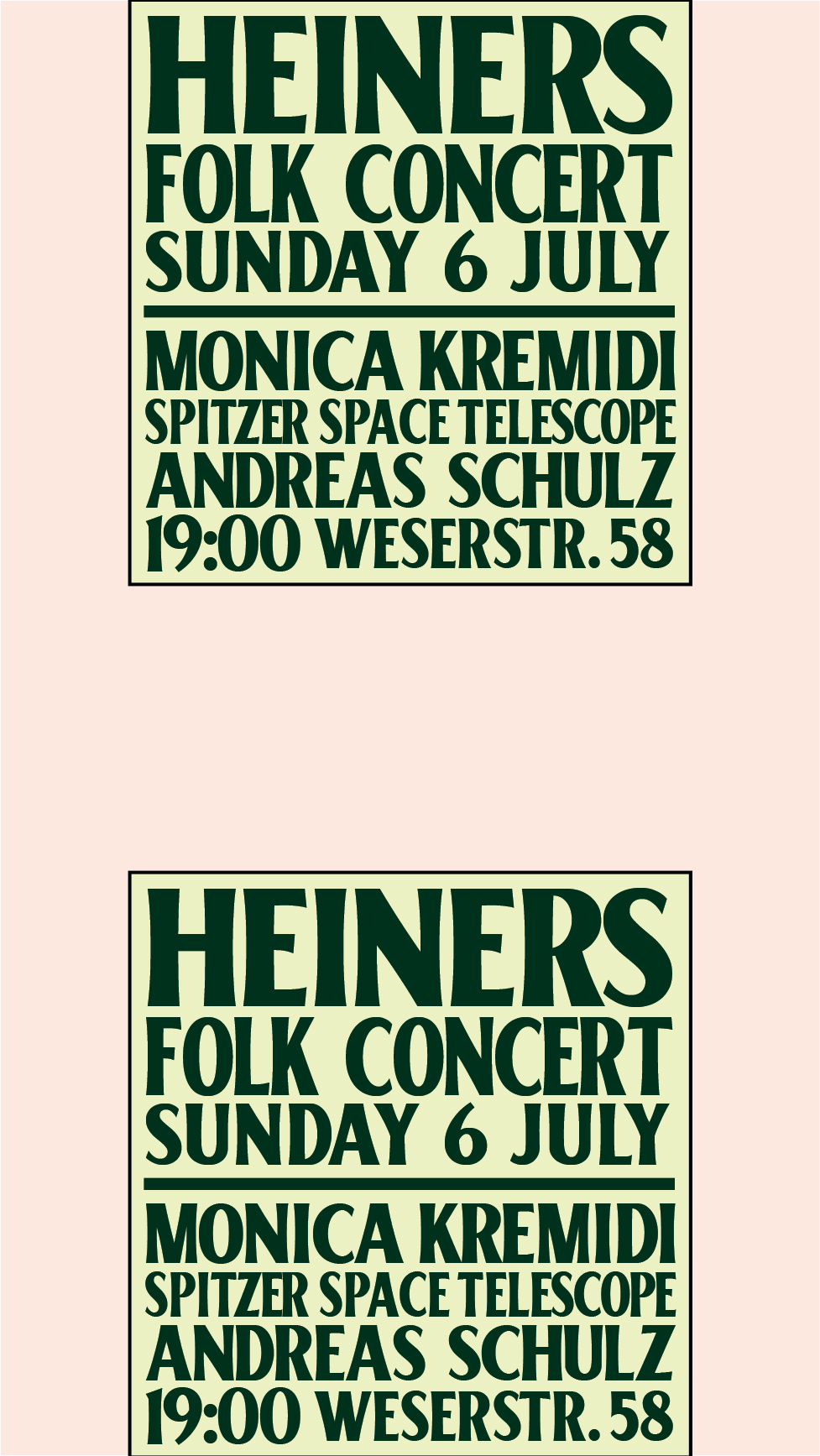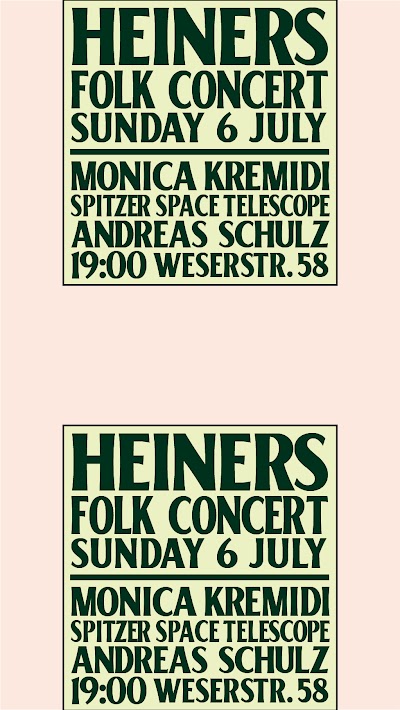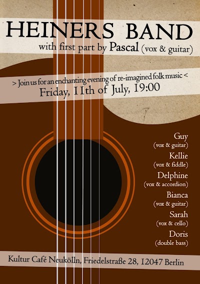 A true folk music variety show at Heiners on Sunday, 6 July featuring three acts: Andreas Schulz, Spitzer Space Telescope (USA / UK), and Monica Kremidi. Enjoy a full range of folk styles and traditions including Irish, English, Old Time, and original material all on one stage. Please come at 19:00 (the concert end at 22:00), and for the musicians it is suggested to donate 15 euro, but for those who can't afford it any donation you can give will be greatly appreciated.
